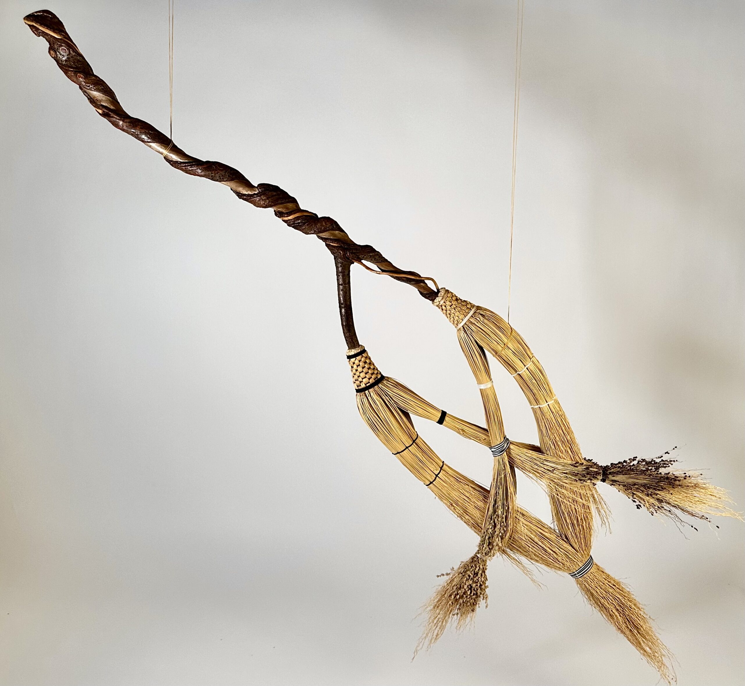 This sculptural wedding broom has been waiting to be connected in perfect harmony for many years, until one day, a vision came to me of how the two heads wanted to be joined into one. A hand-carved Silver Maple branch with entwined Honeysuckle vine represents the foundational family tree and sets off this almost six foot long piece consisting of two sweeper heads hand plaited onto on a bifurcated hardwood handle.