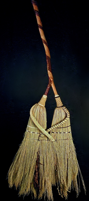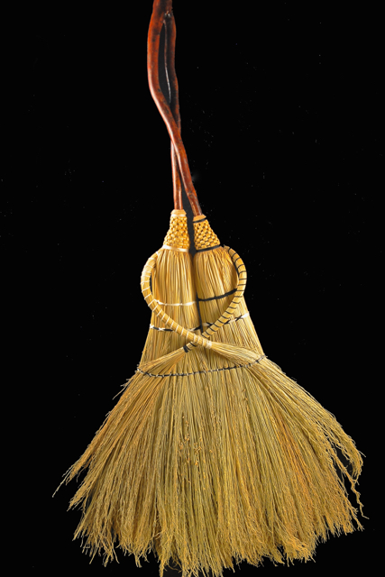 The wedding broom symbolizes the elements of a strong matrimonial alliance. The hardwood handle represents the strong roots of the family tree. The black & white cords depict the balance of light & dark, yin & yang, masculine and feminine. The merging of dual broom heads represents the joining of two families into one. The straws of the broom stand for the many fruits that will be born from their union, and the stitching signifies the ties that bind the couple together, as lovers ‘tie the knot’.